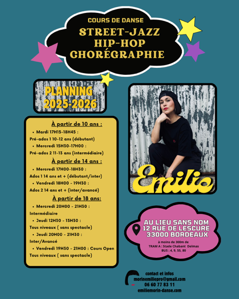 Pour toutes les informations tarif, règlement et inscription dirigez-vous sur le site :https://emiliemorin-danse.com/