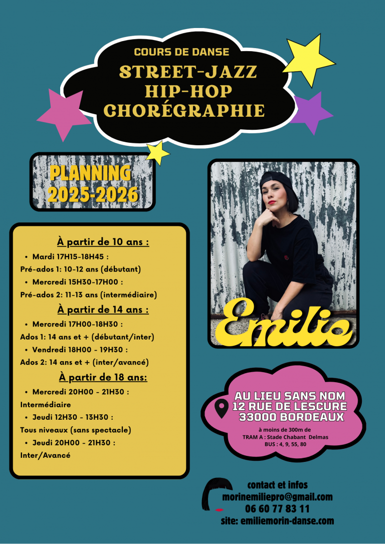 Pour toutes les informations tarif, règlement et inscription dirigez-vous sur le site :https://emiliemorin-danse.com/
